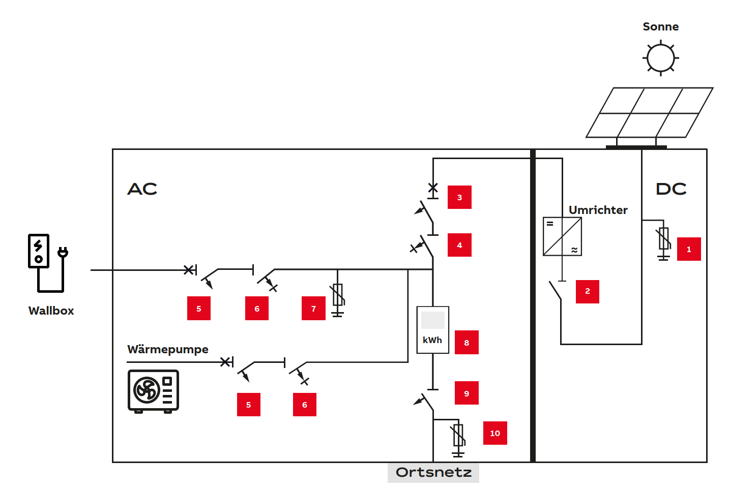 Wenn die Wallbox eine DC-Fehlerstromerkennung hat, können die Elemente 5 + 6 auch durch einen FI/LS, z.B. DS203NC, ersetzt werden.