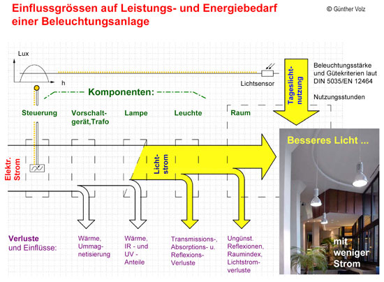 Durch innovative Entwicklungen konnten Lichtausbeute von Lampen und Wirkungsgrad von Leuchten wesentlich verbessert werden. Elektronische Betriebsgeräte erlauben einen bedarfsgerechten Betrieb. Ergonomische und gestalterische Anforderungen lassen sich immer besser verwirklichen. Trotz gestiegenem Lichtkomfort sind bei Modernisierungen Betriebskostenreduzierungen bis zu 80 % möglich! In Büro- und Verwaltungsgebäuden entfallen oft 20 – 40 % der Energiekosten auf die Beleuchtung. Ziel ist auch eine verbesserte Tageslichtnutzung in Gebäuden zur Reduzierung des Energieverbrauchs und Erhöhung der Aufenthaltsqualität. Durch innovative Tageslichttechnik können Räume mit direktem Sonnenlicht versorgt werden und über bauliche Massnahmen auch mehr Diffuslicht erhalten. So kann Tageslicht als edelste Form solarer Energie auf direktem Weg mit hervorragendem Wirkungsgrad genutzt werden!