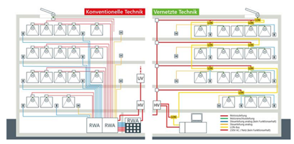 Den Unterschied zwischen der konventionellen Struktur und der digitalen, vernetzten Technik erklärt nachfolgende Verkabelungsstruktur einer Rauchwärmeabzugs-Anlage.