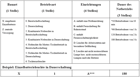 Leuchten für die Notbeleuchtung werden entsprechend ihrem Aufbau in Gruppen eingeteilt und entsprechend gekennzeichnet. Die Kennzeichnung für Typ; Betriebsart, eingebaute Einrichtungen und die Bemessungsbetriebsdauer der Leuchte müssen deutlich sichtbar auf der Leuchte angebracht sein.