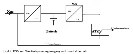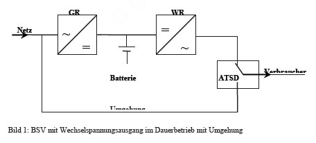 Bei einer BSV mit Wechselspannungsausgang, die im Dauerbetrieb betrieben wird (Bild 1), gibt es keine Umschaltzeiten und somit auch keine Unterbrechungszeiten der Stromversorgung. Dieses ist eines der sichersten Versorgungsarten, hat leider zum Nachteil, dass der Gleichrichter (GR) der die netzseitige Wechselspannung in eine Gleichspannung umwandelt, die dadurch gespeisten und geladenen Batterien sowie der Wechselrichter (WR) der die Gleichspannung wieder in eine sinusförmige Wechselspannung umwandelt, ständig am Netz betrieben werden und somit einer thermischen Alterung unterliegen.