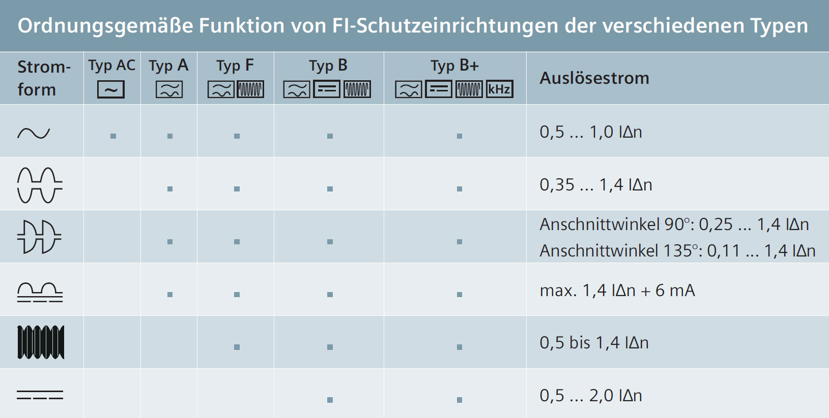 Fehlerstrom-Schutzeinrichtungen unterscheiden sich hinsichtlich ihrer Eignung zur Erfassung unterschiedlicher Fehlerströme.