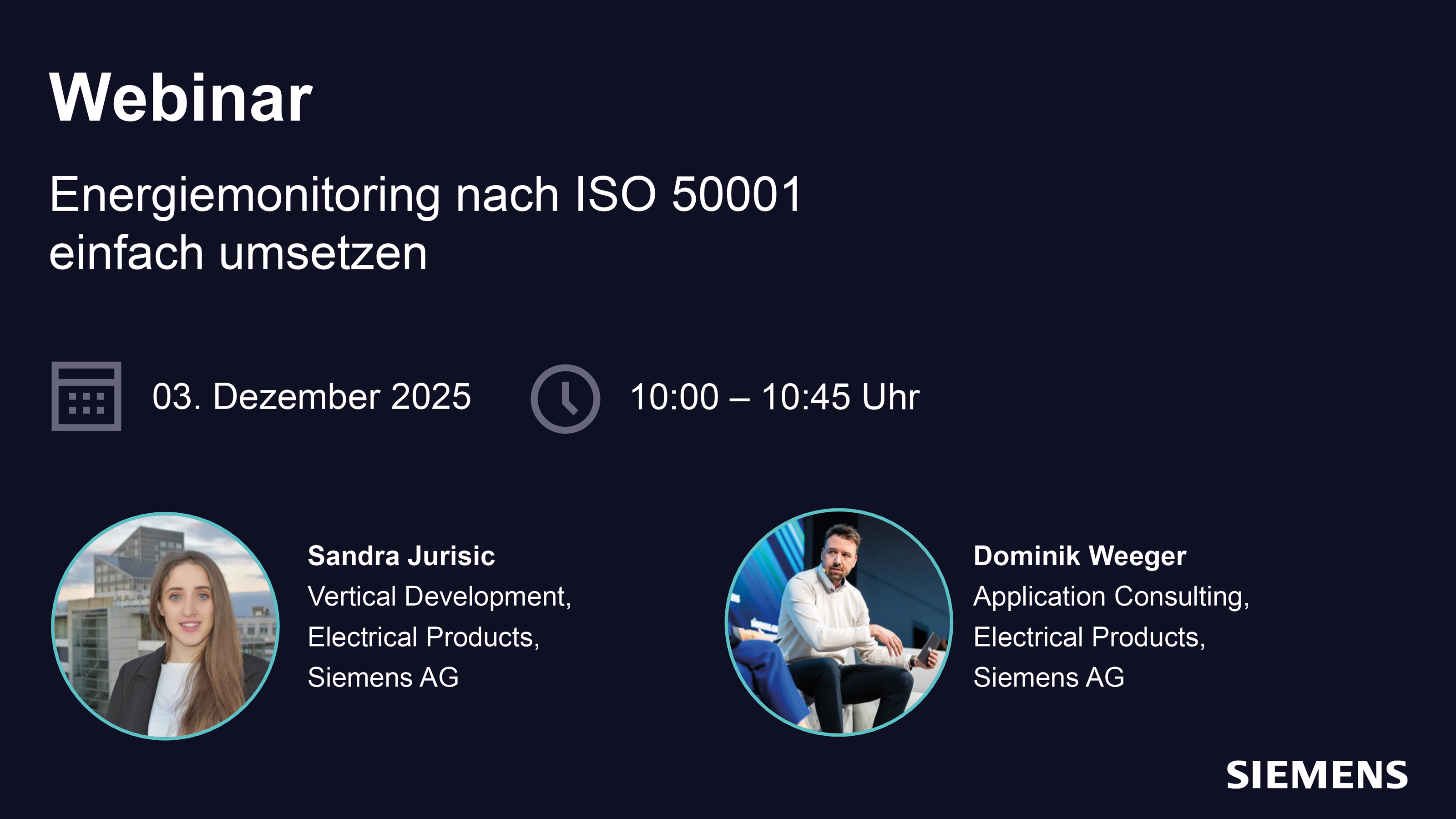 Besuchen Sie auch das kostenfreie Siemens Online-Webinar zum Thema „Energiemonitoring nach ISO 50001 einfach umsetzen“ am 3. Dezember 2025. Oder sehen Sie sich im Nachgang die Aufzeichnung hierzu an.