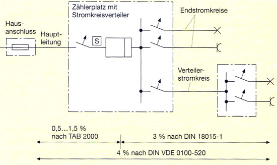 Dem zulässigen Spannungsfall innerhalb einer Verbraucheranlage (Bild 1) ist recht enge Grenze (4%) gesetzt. Der relative Spannungsfall wird ermittelt zu