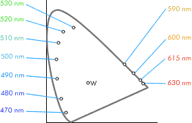 Der Farbton der LED wird als dominante Wellenlänge definiert. InGaN-Dioden haben eine geringere Farbsättigung, sie sind nicht streng monochromatisch.