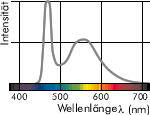 Durch die Dosierung des Leuchtstoffs können die spektralen Anteile des blauen und des gelben Lichts eingestellt werden. So sind verschiedene Weißtöne zu erreichen. |