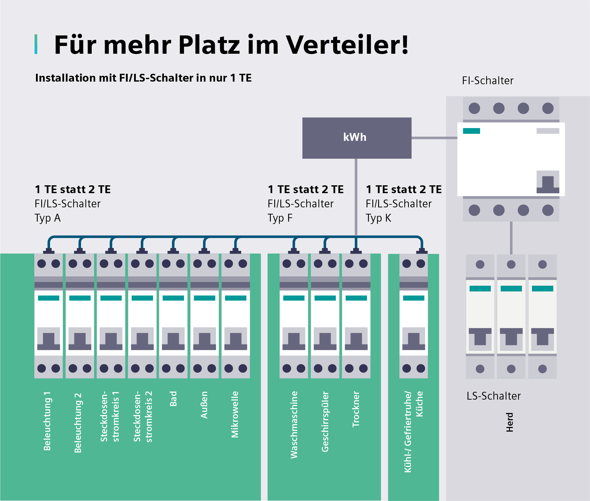 Obwohl FI/LS-Schalter eine Baueinheit bilden, belegen sie bei der Installation meist zwei Teilungseinheiten (TE). Das kann problematisch sein, wenn der Schalter, etwa im Zuge einer Gebäudeautomatisierung, in einen bestehenden Verteilerschrank mit wenig Platz eingebaut werden soll.