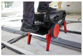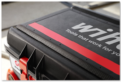- Als Mess- und Sägehilfe für kleinere Arbeiten, wie z.B. beim Ablängen von Kabelkanälen, Rohren oder Stangen, dienen zwei eingelassene Kerben im Kofferdeckel, in die das Material eingelegt und dank integrierter Maßanzeige gemessen werden kann.