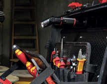 - Ist die Arbeitsumgebung einmal schlecht beleuchtet, lassen sich magnetische Arbeitsleuchten an Fixierpunkten im Kofferdeckel und im ausziehbaren Zuggriff befestigen. So sorgt ihr für mehr Licht da wo ihr es braucht.