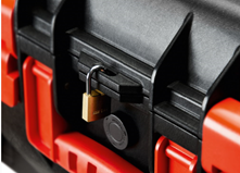 - Zum Diebstahlschutz von Werkzeugen ist eine Vorrichtung integriert, anhand welcher der Koffer per Vorhängeschloss gesichert werden kann.