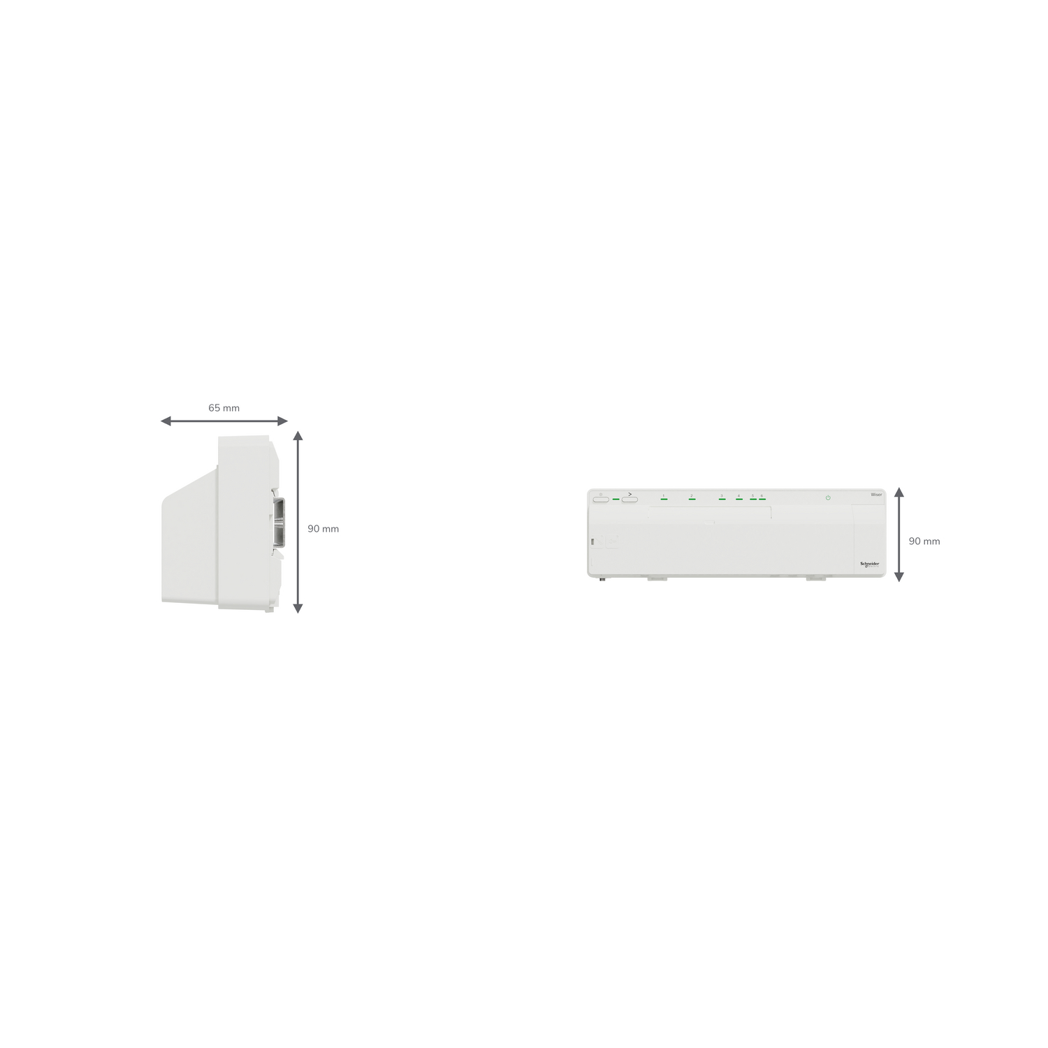 Wiser Verteilerleiste regelt die Ventile der Fußbodenheizung für die Wiser-Heizungssteuerung (Zigbee). Smartes Mehrzonen-Regelsystem für Fußbodenheizsysteme. Bis zu 64 Geräte inklusive Hub können über ein System verbunden werden. Weitere Details in der Online-Dokumentation. 305 x 90 x 65 mm. Modulare Smart Home Anbindung über das Wiser-System, APP-Steuerung vor Ort und aus der Ferne, Zeitpläne, Momente (Szenen) und Automatisierungen per Wiser Home APP. Zigbee 3.0. Kompatible Ventil-Adapter notwendig. Einfache Wandmontage, zusätzliche Antenne für Zigbee-Vernetzung mit dem Haussystem. System-Konfiguration über die Wiser Home-APP (Online und Offline!), Zusätzliche Installationsunterstützung über eSetup-APP für den qualifizierten Elektriker.