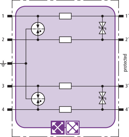 Platzsparendes Kombiableiter-Modul mit LifeCheck zum Schutz von 2 Doppeladern erdpotentialfreier symmetrischer Schnittstellen. LifeCheck erkennt thermische oder elektrische Überlastzustände nach denen der Ableiter auszutauschen ist. Die Anzeige erfolgt berührungslos mittels DEHNrecord LC / SCM / MCM.