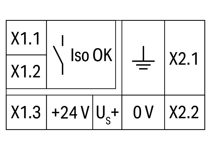 Das Produkt signalisiert die Unterschreitung eines nicht-einstellbaren, unsymmetrischen Isolationswiderstandes zwischen +24 V bzw. 0 V der Versorgungsspannung und Erde mittels eines potentialfreien Kontaktes („Iso OK“) und Status-LEDs. Der „Iso OK“-Kontakt kann über eine speicherprogrammierbare Steuerung ausgewertet werden. Dieser Zustand wird bis zum nächsten Messintervall aufrechterhalten.