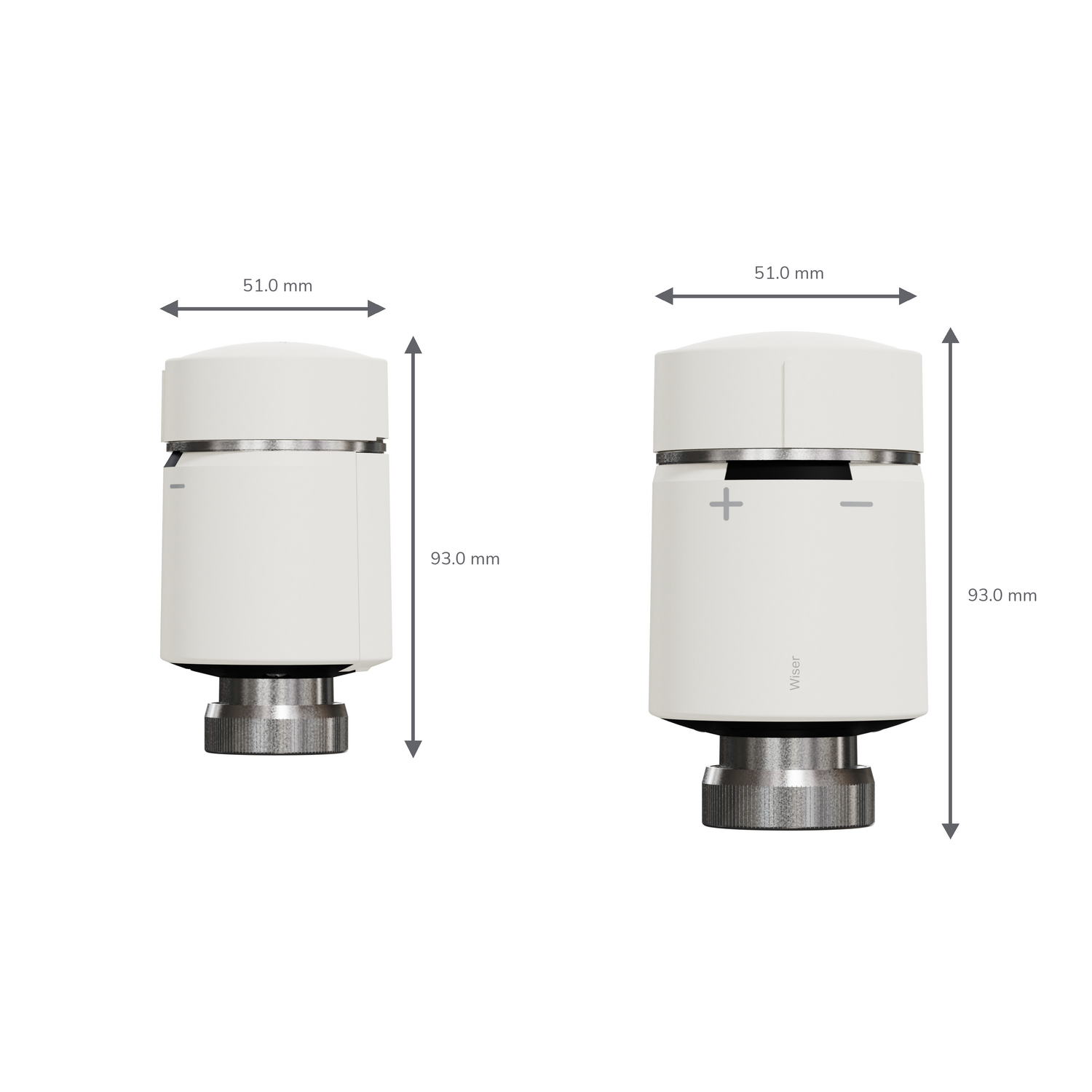 Wiser Heizkörperthermostat regelt den Heizkörper-Warmwasserdurchfluss innerhalb einer Wiser-Heizungssteuerung (Zigbee). Einfache Montage und Inbetriebnahme. Bis zu 64 Geräte inklusive Hub können über ein System verbunden werden. Weitere Details in der Online-Dokumentation. 51 x 93 mm (Durchmesser x Tiefe). Modulare Smart Home Anbindung über das Wiser-System, APP-Steuerung vor Ort und aus der Ferne, Zeitpläne, Momente (Szenen) und Automatisierungen per Wiser Home APP. Zigbee 3.0. Einfach Montage, Batteriebetrieb über 2x Alkaline-Batterien (AA). Nachfolger von MEG5935-0000. System-Konfiguration über die Wiser Home-APP (Online und Offline!), Zusätzliche Installationsunterstützung über eSetup-APP für den qualifizierten Elektriker.